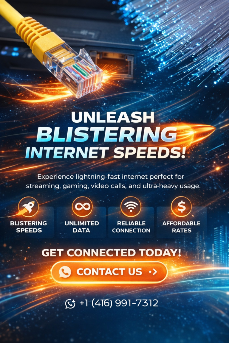 Experience lightning-fast internet designed for streaming, gaming, video calls, and heavy online usage. Enjoy blistering speeds, unlimited data, a reliable connection, and affordable rates. Get connected today and power your home or business with high-performance internet you can count on.